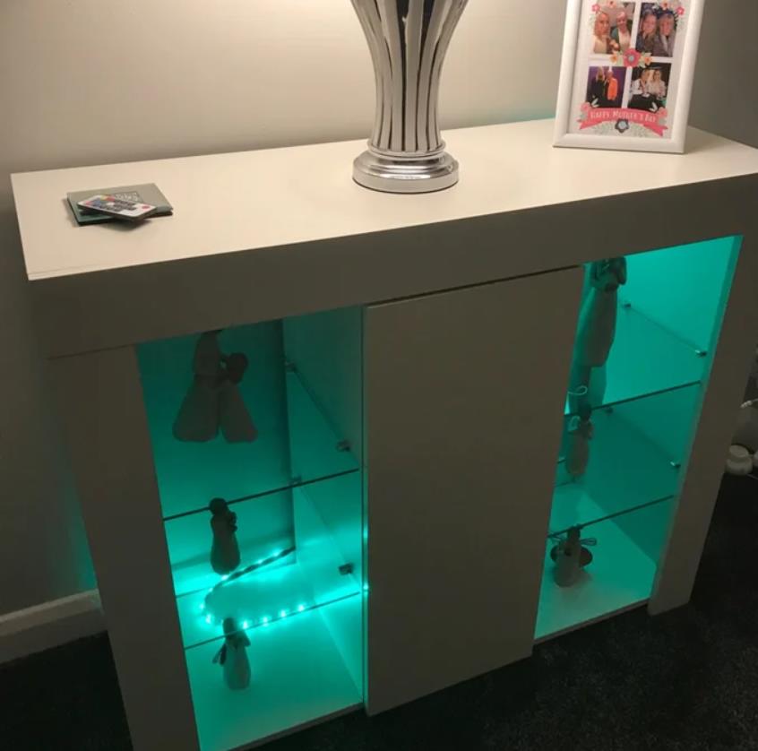 Но это еще не все! По краям комода расположены стильные открытые ниши с двумя стеклянными полками. Они идеально подходят для демонстрации ваших любимых предметов декора, фотографий или коллекционных фигурок. Прозрачное стекло позволяет любоваться содержимым, не загромождая пространство.