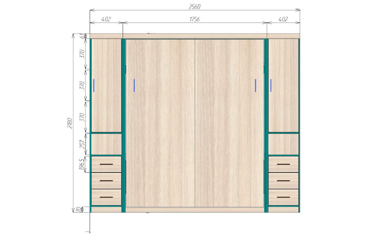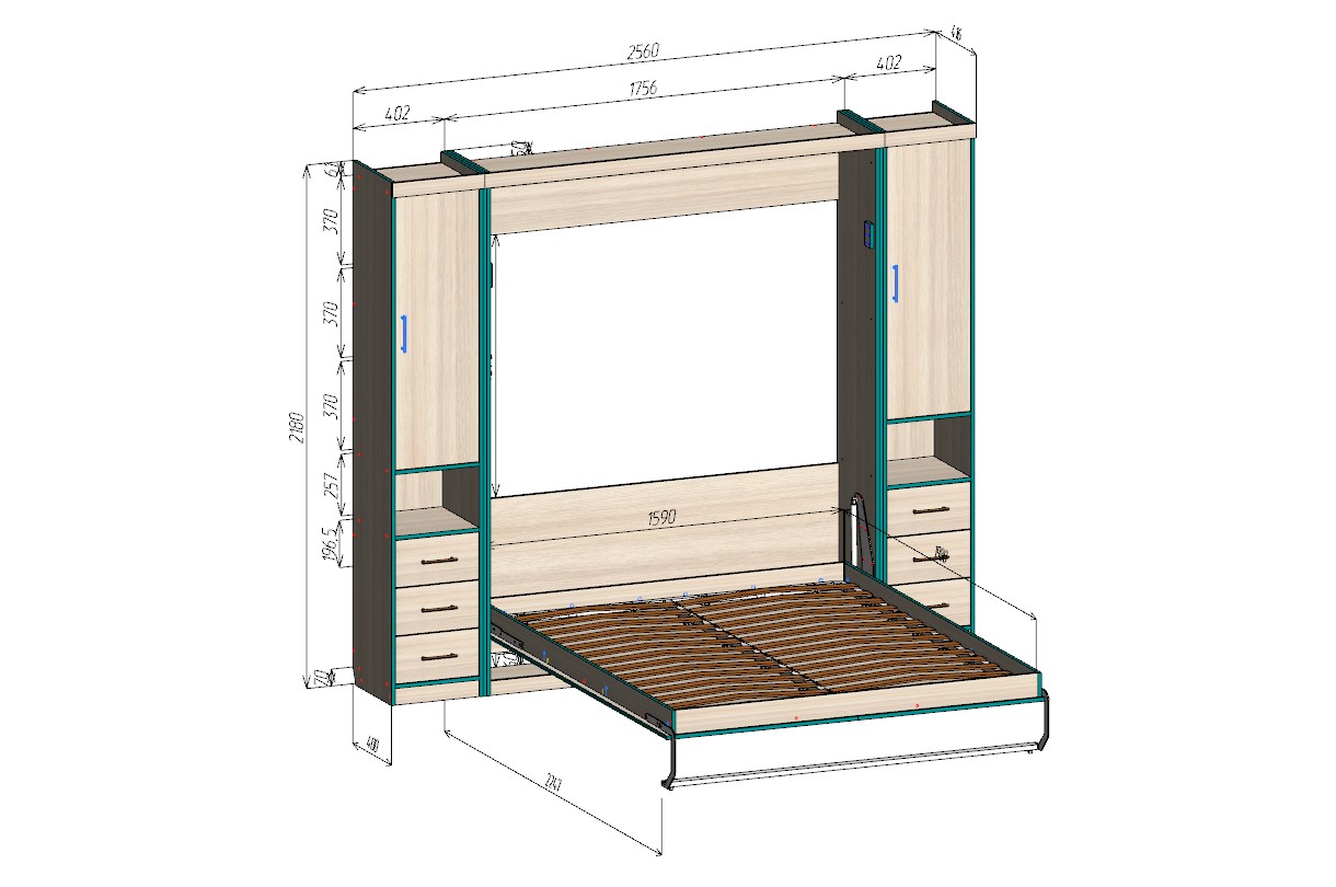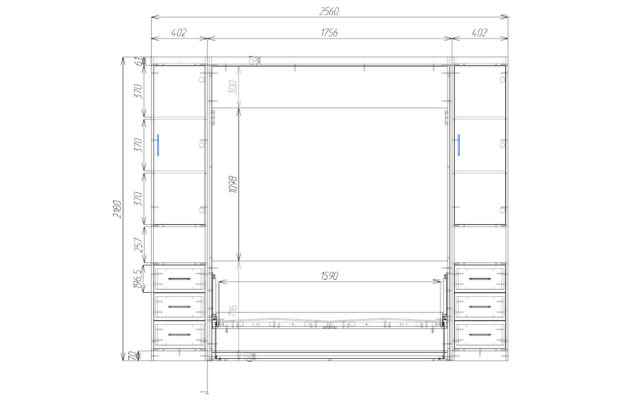 Белоснежные рамочные фасады и лаконичные ручки-кнопки подчеркивают классический характер дизайна. По бокам расположены симметричные колонки с распашными отделениями, нишами и выдвижными ящиками для хранения одежды, белья и мелочей. В центральной части находится откидная кровать-трансформер, которая в сложенном виде аккуратно замаскирована под фасады шкафных дверей, поэтому композиция выглядит цельной и “чистой”.