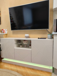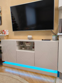 По бокам расположены две распашные дверцы, за которыми находятся вместительные отделения с полками для хранения приставок, документов, кабелей и других необходимых мелочей. В центральной части предусмотрена откидная дверца, а над ней расположена открытая ниша со стеклянной полкой. Такое решение делает тумбу не только удобной в использовании, но и визуально более легкой. На открытой полке можно разместить декор, книги или мультимедийные устройства.